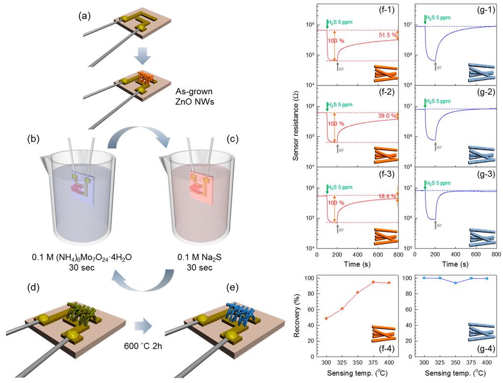 (a–e) Schematic illustration of the synthesis process of Mo-doped ZnO NW network gas sensors. Sensing transients of pure and Mo-doped ZnO NW network gas sensors to 5 ppm H2S at 300, 325, and 350 °C: (f-1) ZnO NW sensor, 300 °C; (f-2) ZnO NW sensor, 325 °C; (f-3) ZnO NW sensor, 350 °C; (g-1) Mo-doped ZnO NW sensor, 300 °C; (g-2) Mo-doped ZnO NW sensor, 325 °C; and (g-3) Mo-doped ZnO NW sensor, 350 °C; (f-4,g-4) Recovery (%) = (Rair-recovery − Rgas-H2S)/(Rair-fresh − Rgas-H2S) × 100 (%) of pure and Mo-doped ZnO NW sensors at 300–400 °C (where, Rair-fresh: sensor resistance in air before exposure to H2S, Rgas-H2S: sensor resistance in 5 ppm H2S, and Rair-recovery: sensor resistance in air after 10 min exposure to air). Reproduced from [] with permission. Copyright (2014) The Royal Society of Chemistry.