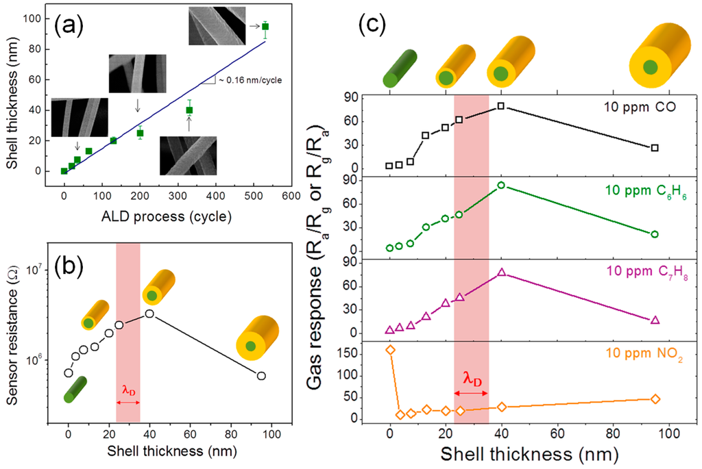 Various research groups have reported the synthesis and chemiresistive gas sensor application results of core-shell NWs using n-n heterojunctions with SnO2 and ZnO [,,,]. Choi et al. [] prepared various SnO2-ZnO core-shell nanocables with different shell thicknesses by controlling the cycle numbers of the atomic layer deposition (ALD) (Figure 6a) and investigated their gas-sensing characteristics. The gas response and sensor resistance in air increased with the increase of the shell layer thickness up to 40 nm and then decreased with further thickening (Figure 6b,c). The decrease of sensor resistance in air and gas response with increasing shell thickness from 40 to 95 nm can be attributed to the increase of the nondepleted region in the shell layers, which explains that the core-shell configuration is effective to enhance gas response. However, the decrease of sensor resistance with decreasing shell layer thickness from 40 to 3 nm cannot be explained if it is assumed that the conduction occurs only along the shell layers. Accordingly, Choi et al. attributed this decrease of sensor resistance by conduction both along the shell layer and near-interface core layers to the “electric field smearing effect”.
