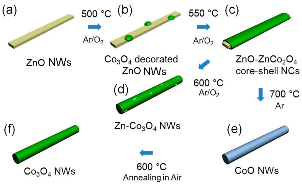 The present authors [] have successfully transformed single crystalline ZnO NWs into various p-type semiconductor NWs by the vapor-phase method. ZnO NWs prepared by the thermal evaporation method was transformed into Co3O4-containing NWs by using CoCl2 powder as a cation source at 500–700 °C (Figure 7). When the reaction between ZnO NWs (Figure 7a) and CoCl2 was carried out at 500 °C, the surface of the ZnO NWs were decorated by Co3O4 nanoparticles (Figure 7b). At 550 °C, ZnO-ZnCo2O4 core-shell nanocables were obtained (Figure 7c), while at 600 °C, Co3O4 NWs’ trace concentration of residual Zn remained (Figure 7d). When the temperature was raised to 700 °C, complete transformation of ZnO NWs into CoO NWs was successful (Figure 7e), and by annealing CoO NWs at 600 °C, phase-pure Co3O4 NWs could be obtained (Figure 7f) []. Similarly, full conversion of ZnO NWs into Mn3O4 NWs and NiO NWs was possible by thermal evaporation of MnCl2 and NiCl2 at 750 and 700 °C, respectively [,].