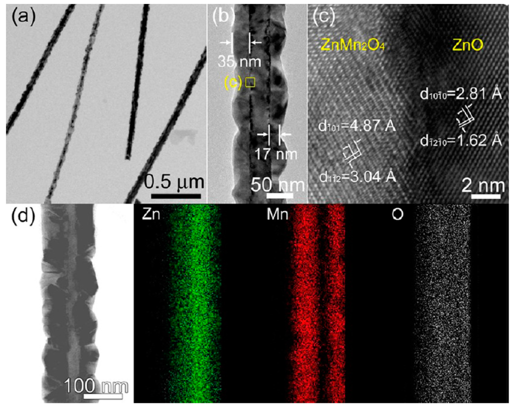 Morphologies and crystal structures of ZnO-ZnMn2O4 NCs: (a,b) TEM images of ZnO-ZnMn2O4 NCs grown on Si substrates; (c) Lattice-resolved image of ZnO-ZnMn2O4 NCs; (d) Energy dispersive X-ray spectroscopy (EDS) elemental mapping of Zn, Mn, and O. Reprinted from [] with permission. Copyright (2012) American Chemical Society.