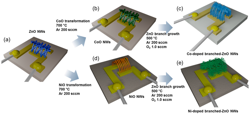 (a) Growth of ZnO NWs on alumina substrate with Au electrodes; (b) transformation of ZnO NWs into CoO NWs; (c) growth of Co-doped branched ZnO NWs from CoO NWs; (d) transformation of ZnO NWs into NiO NWs; (e) growth of Ni-doped ZnO NWs from NiO NWs. Reproduced from [,] with permission; (a–c) [] Copyright (2014) American Chemical Society; (d,e) [] Copyright (2015) Elsevier.
