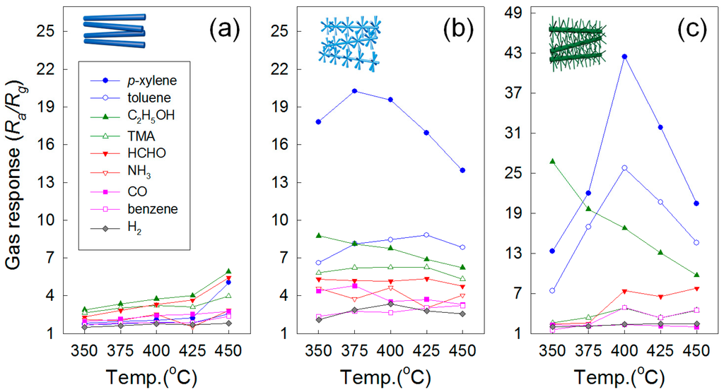 Gas response of (a) pristine ZnO; (b) Co-doped branched ZnO NWs; and (c) Ni-doped branched ZnO NWs to 5 ppm p-xylene, toluene, C2H5OH, TMA, HCHO, NH3, CO, benzene, and H2 at 350–450 °C. Reproduced from [,] with permission; (a,b) [] Copyright (2014) American Chemical Society; (c) [] Copyright (2015) Elsevier.