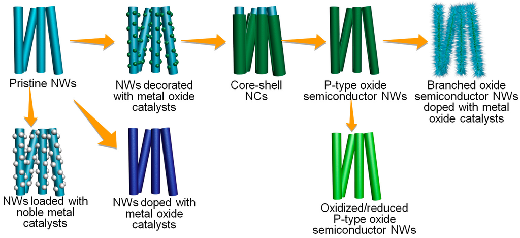 Physicochemical modification of oxide NWs provides diverse strategies to achieve selective gas detection. Schematic structures of various oxide NWs reviewed in this contribution were summarized in Figure 12. The oxide semiconductor NWs can be decorated with metal oxide catalysts as well as noble metal catalysts to promote the sensing of a specific gas. The doping of catalytic materials within the lattice of sensing materials may be considered when the ionic sizes of dopant and host cation are similar to each other. The n-type oxide NWs can be transformed either to core(p-type oxide semiconductor)-shell(n-type oxide semiconductor) NCs or to p-type oxide semiconductor NWs through the control of reaction temperature and time in vapor-phase cation exchange reaction, both of which can be used to enhance or tune the gas selectivity. Finally, the catalyst-doped branched oxide NWs exhibit superior gas selectivity by catalytic promotion of a specific gas-sensing reaction as well as high gas response by the increase of chemiresistive branch-to-branch junctions.