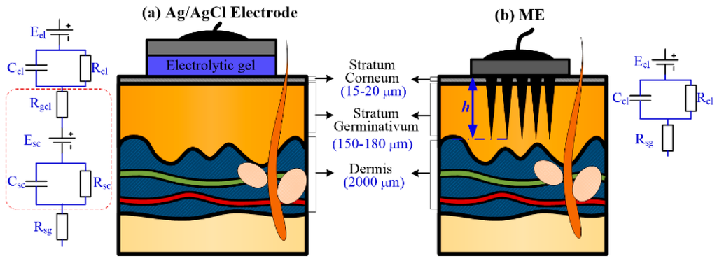 Bio-signals, such as electrode-skin interface impedance (EII), electromyography (EMG), electrocardiography (ECG) and so on, are important physiological parameters and widely used in medical treatment, disease monitoring and medical research. Bio-signals are difficult to obtain due to their weak and unstable characteristics [1,2]. Electrodes are good biosensors used to collect these bio-signals [3]. Wet electrodes, dry electrodes and micro-needles electrodes (MEs) are typical ones used for bio-signal monitoring. Wet electrodes, such as typical commercial Ag/AgCl electrodes, are the most popular non-invasive electrode in clinical practice. However, several drawbacks limit their further application: (1) wet electrodes cannot reach the conductive layers of the epidermis due to the stratum corneum which hinders the extraction of signals, as shown in Figure 1a; (2) the necessary conductive gel may cause skin irritations and allergic reactions; (3) wet electrodes are not suitable for long-term bio-signal monitoring due to the slow drying of the conductive gel and increase of EII [4,5,6,7]. To eliminate the need for gel application dry electrodes are employed [8,9], however, the stratum corneum must be removed to decrease EII before bio-signal recording. This skin preparation process may damage or irritate the skin. Furthermore, dry electrodes is so sensitive to human motion that the signals may be easily disturbed. MEs are proposed to solve these problems. A ME has the following advantages: (1) it can puncture through the stratum corneum and eliminate the influence of the stratum corneum on the impedance, as shown in Figure 1b. The puncture process is almost painless; (2) the contact interface between the ME and the skin is more stable and thus can attenuate motion artifact; (3) the possibility of skin irritation or allergies can be eliminated without skin preparation [5,6,10]. However, MEs also have the disadvantage that the microneedles are easily broken during the insertion process [5,11]. This is a big challenge for practical ME applications.