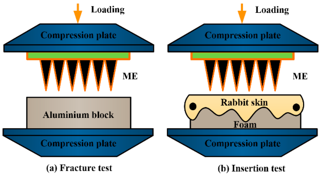 ME has the disadvantage that microneedles may be fractured in the skin during the insertion process and cause skin infections. Robustness determines whether the ME can puncture the skin without being broken. The fracture test was performed on a universal test machine (LR10K Plus, Lloyd Instruments, Bognor Regis, UK). The range of the force sensor is 100 N. The fracture test procedures were performed as follows: (1) ME was fixed on the upper compression plate as shown in Figure 3a. An aluminum block (size: 5 cm × 5 cm × 2 cm) was fixed on the bottom compression plate; (2) The ME was moved downwards the aluminum block at a speed of 0.01 mm/s. The loading force and displacement were recorded simultaneously; (3) The test was stopped when the loading force was 45 N; (4) The ME test results were analyzed using SEM (JSM-6380LA, JEOL).