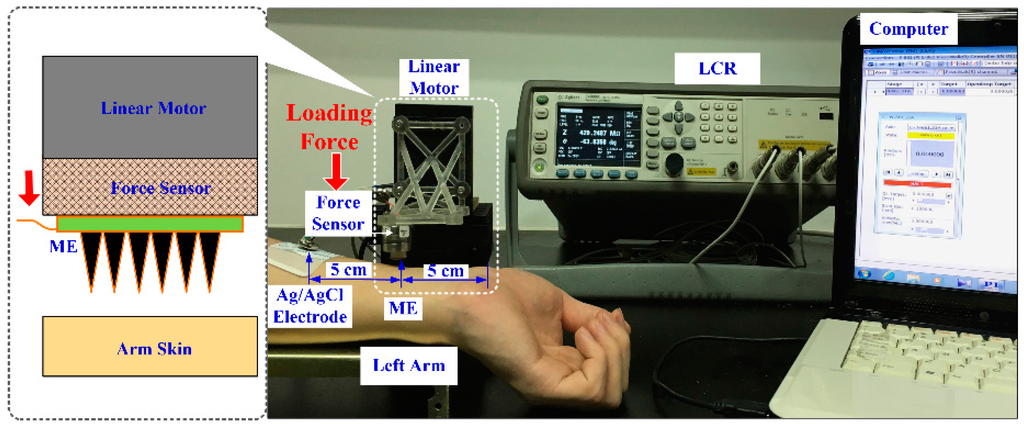 A setup designed for the EII recording during the ME insertion process is shown in Figure 4. A two-electrode measurement method was employed to record EII [3,22]. The placements of the ME and Ag/AgCl electrode are shown in Figure 4. The electrodes were connected to a precision impedance analyzer (E4980A LCR Meter, Agilent, Palo Alto, CA, USA). A linear motor (E-861, PI, Karlsruhe, Germany) with a force sensor (Nano 17 Titanium, ATI Industrial Automation, Detroit, MI, USA) were used to load the ME on the forearm. The EII signal, insertion force, and insertion displacement could be simultaneously recorded by a self-developed software.