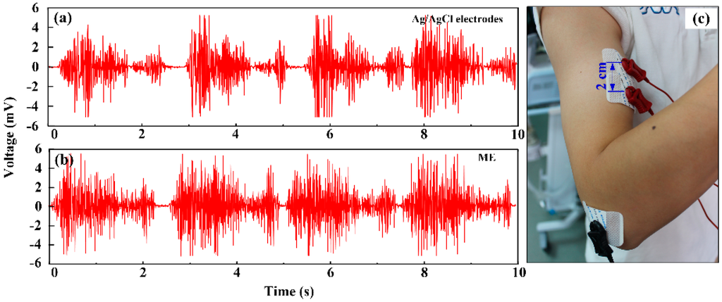 The biceps brachii muscle was chosen as the EMG monitoring object and a differential method was employed to record EMG signals. The placement positions of the electrodes are shown in Figure 5c. Two measuring electrodes (such as ME or Ag/AgCl electrodes) were placed on the biceps brachii muscle with an interval of 2 cm. The grounding electrode (Ag/AgCl electrode) was on the elbow. The electrodes were connected to a tele-EMG system (MyoSystem2400T, Noraxon, Scottsdale, AZ, USA). The volunteers held a 1.5 kg dumbbell and flexed the elbow every 2–3 s and EMG signals were recorded. The test would last about 5 min. During the test, the amplifier gain was set at 2000, and the sample rate was set at 1000 Hz. A 20 Hz–450 Hz Butterworth band-pass filter was used.