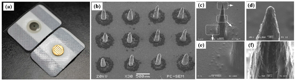 (a) ME and Ag/AgCl electrode; (b) SEM image of MA; (c) micro-needle; (d) micro-needle tip; (e) micro-needle bottom; and (f) micro-needle middle.