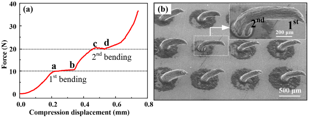 Figure 7a presents the resistance force of the ME during the fracture test. Figure 7b is the SEM image of a bent ME after the fracture test. As the MA tips are in contact with the aluminum block, the resistance force linear increases with loading displacement. As the loading proceeds, micro-needles begin to yield. When the loading displacement is close to point “a”, the MA tips start to buckle and bend. The resistance force at the first bending is about 10 N. Thus, the maximum press force for the ME (buckling force) without being bent is about 10 N. The tips are seriously bent to about 90° at the point “b”. The first bends in tips are shown in Figure 7b. The resistance force increases rapidly as the MA is further compressed. This is a compression force along the axial direction of the micro-needles. As the compression force is beyond the buckling force, the micro-needles begin to bend again, this time at point “c”. The second bending at the middle section of the microneedle is also shown in Figure 7b. The resistance force at the second bending is about 20 N. The loading process is stopped when the resistance force is 45 N. The micro-needles could be bent without being broken as shown in Figure 7b. Above all, ME has strong toughness and strength which could prevent the micro-needles from breaking off in the skin during bio-signal recording.