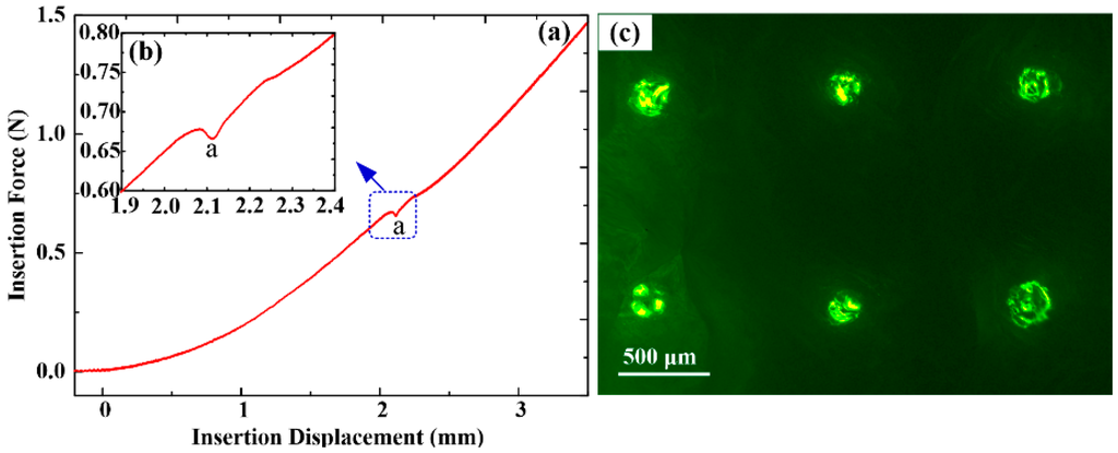 (a) Insertion force vs. displacement curve; (b) the penetration point; and (c) fluorescence image of punctured rabbit skin.