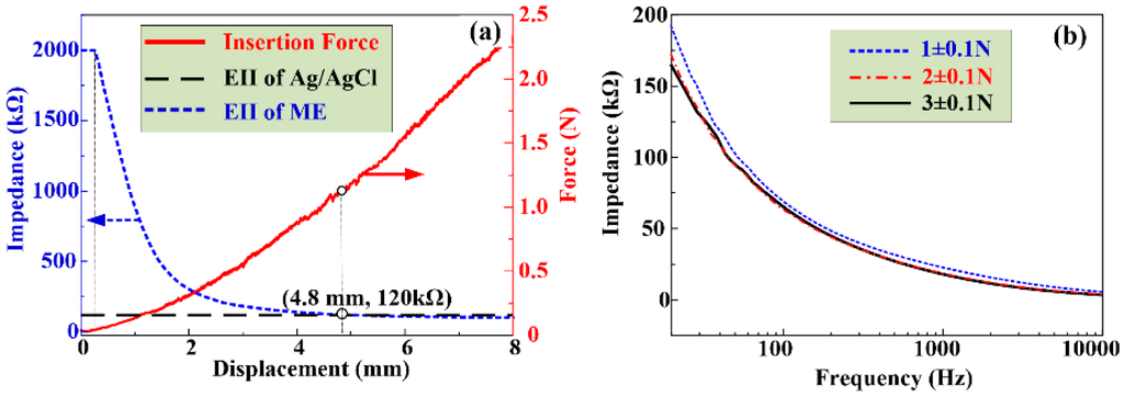 In order to better understand the effect of insertion force on EII recording, the EII recording properties of the ME during the insertion process were tested. The left inner forearm was chosen as the measurement site due to its features of less hair and thinner stratum corneum [10,26]. The speed of the linear motor was 0.5 mm/s; the injection voltage of the LCR meter was 1 V; and its frequency was 50 Hz. We also recorded EII with input voltage frequency ranging from 20 Hz to 10 kHz under a constant compression force (about 1, 2 or 3 N). If the impedance measured was greater than 2 MΩ, the testing result would be set as 2 MΩ.