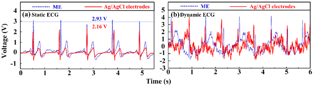 ECG signals recorded by Ag/AgCl electrodes and ME in the (a) static state; and (b) dynamic state.