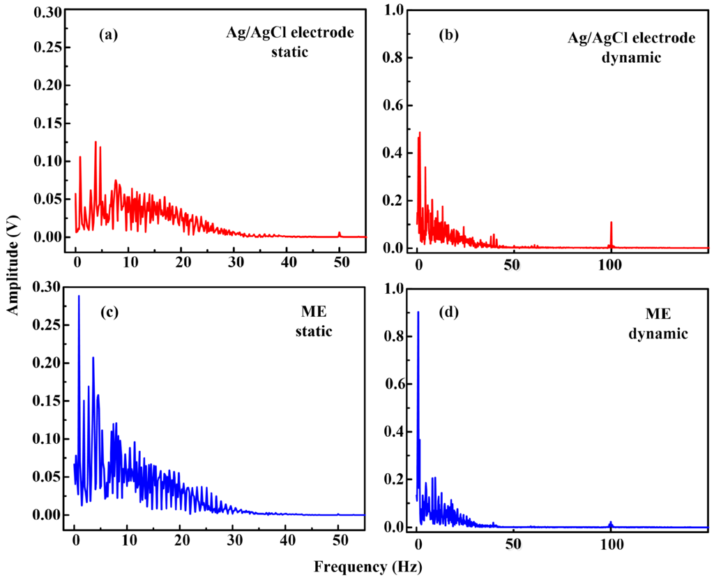 Frequency spectrum of ECG signals recorded by Ag/AgCl electrode and ME: (a,c) at the static state; and (b,d) at the dynamic state.