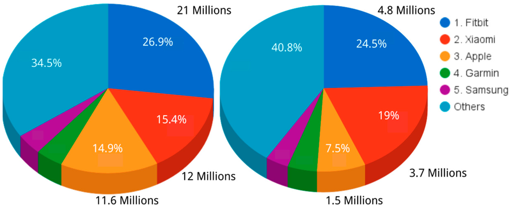 Nowadays, there are many different vendors of wearable devices. The left side of Figure 1 shows the market share of the main devices based on data from the whole 2015 year [30]. Fitbit was the leading company in the sector of smartbands as it covered more than one third of the market share. Next, developers were Xiaomi and Apple, with around 15% of the market share each. It is important to notice that with a market share under 5% there were more than 40% of devices from several companies. In 2015, a total number of 78.8 million units of wrist wearables were sold worldwide. This trend continues in 2016, because in the first quarter of the year around 20 million units have already been sold [31]. Figure 1 on the right side shows similar figures to the 2015 ones during the first quarter of 2016. These figures show that wrist wearables are being consolidated as a new electronic consumer product, whose adoption is predicted to increase over the next year [32].