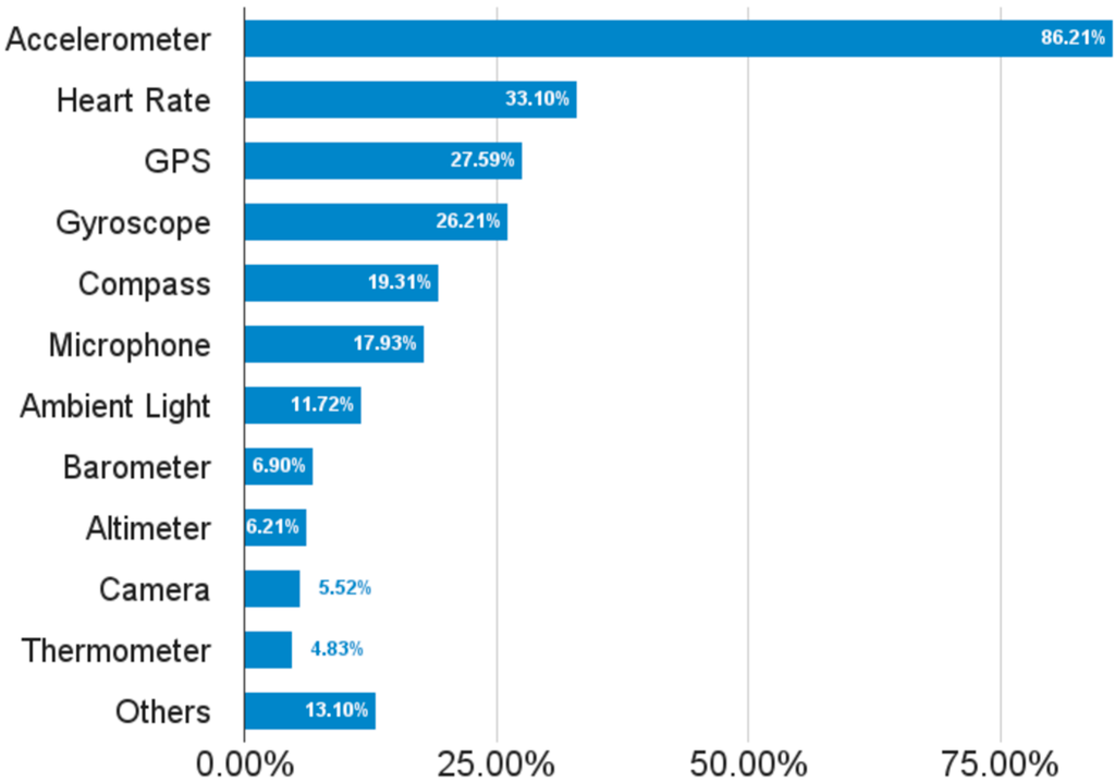 In addition to the variety of devices, OSs and platforms, there is also a great variety in sensors included in wearables. Figure 3 shows the percentage of sensors available in the more than 140 wrist wearables analyzed in our piece of research [37,38,39,40,41,42,43,44,45,46]. As is shown in the figure, the Heart Rate (HR) and movement-related sensors (e.g., accelerometer, GPS, gyroscope, compass) are the most common ones. The variety of sensors provides a new source of diversity. Moreover, there are many differences related to the precision of sensors [47,48,49,50], that can depend on how the wearable is situated [51,52]. In any case, it is generally accepted that sensors’ precision is enough for non-medical purposes, such as self-quantification and fitness scenarios. As our piece of research is situated in this context, we do not tackle these issues in this paper.