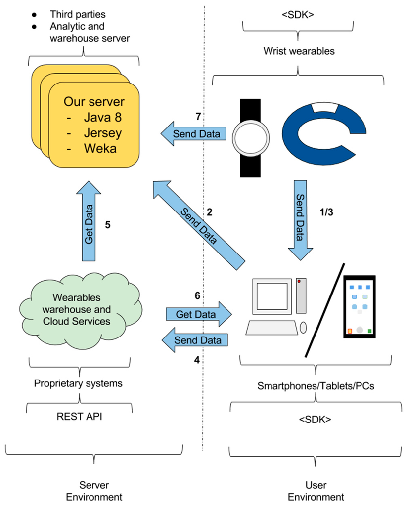 In order to perform the transfer of data to the third-party server, several options can be available depending on the wearable. Check Figure 4 clock-wise. In some cases, wearable device vendors (e.g., iOS) provide SDKs to enable the development of apps for wearables to directly collect and send data. In the case of smartphones, tablets and PCs, SDKs are available to develop apps that collect data directly from linked smartwatches, from the smartphone itself or from a proprietary warehouse. Using these SDKs, third-parties can develop specific software to collect data on wearables and send it to other systems. Proprietary warehouses and cloud services usually provide a REST API. This REST API allows third-parties to gain access to users’ data.