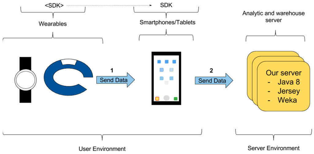 - Data collection. Data is captured by the sensors available in wearable devices and smartphones.