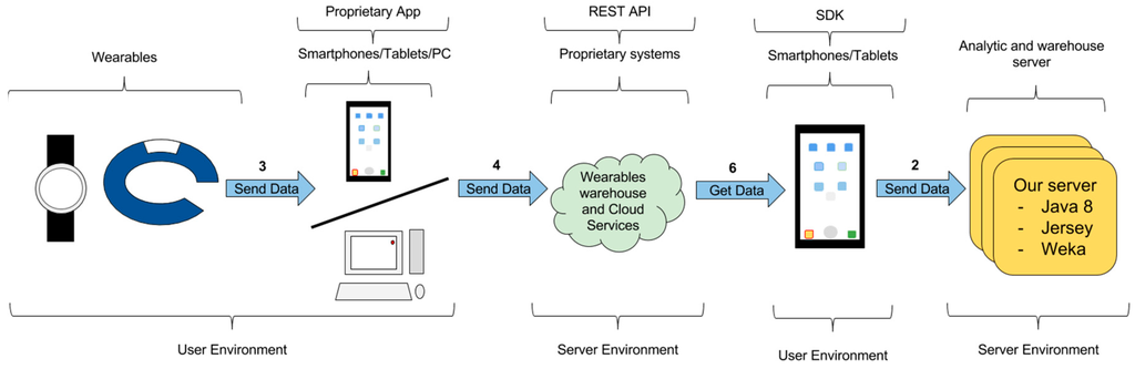 The warehouse data transfer has some disadvantages in relation to the wearable data transfer. The main one is related to the collection of data in real time. In the warehouse data transfer case, the transfer of data from the wearable to the proprietary warehouse is performed sporadically at random times. Sometimes, the time between transfers can be in the order of several days. On the contrary, in the case of wearable data transfers, this can be produced at specific time intervals. A second drawback of the warehouse data transfer is related to the nature of data. Usually, when data is transferred to the proprietary warehouse some kind of processing is performed (e.g., summarization). In the case of wearable data transfer, usually it is raw data. For example, in general the nominal values of the accelerometer cannot be collected from a warehouse.