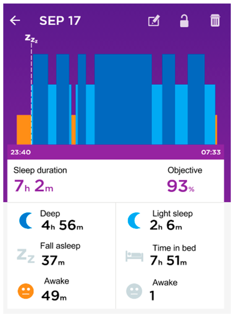 - De Arriba Perez, F.; Santos Gago, J.M.; Caeiro Rodriguez, M. Calculation of Sleep Indicators in Students Using Smartphones and Wearables. New Adv. Inf. Syst. Technol. 2016, 445, 169–178. [Google Scholar]