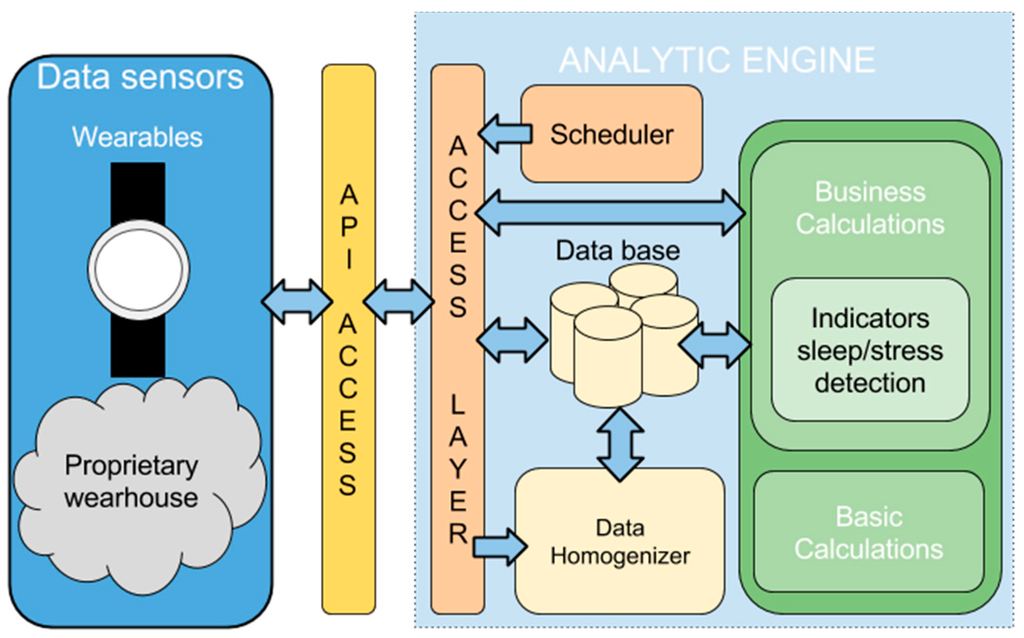 The work described in this paper is about the processing of data collected from wearable sensors and transferred to servers. Similar works with different goals but using the same approach can be found in the recent literature. In [65], an architecture is proposed involving a smartphone to transfer data from a sensor to a server to calculate insomnia indicators. The key difference with the solution described in this paper is in the type of devices. In our case, we use commercial devices from different developers and the provided communication protocols. Android Wear and Google Fit, as described in Section 4.4, have been proposed as solutions to standardize data collection, but they are not broadly supported by commercial products; and other issues, such as homogenization, need to be considered.