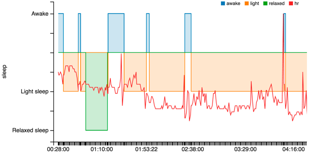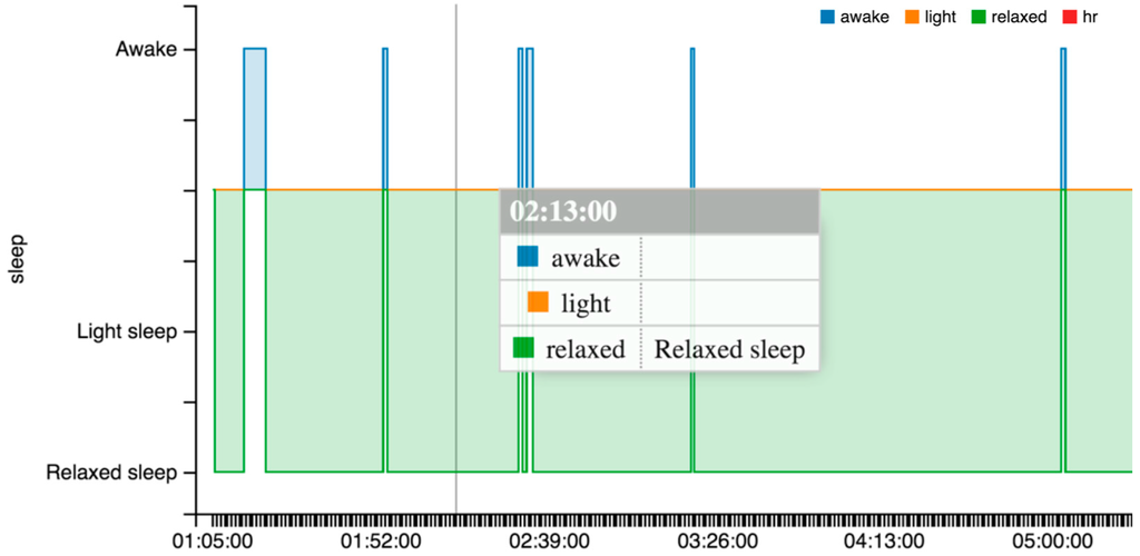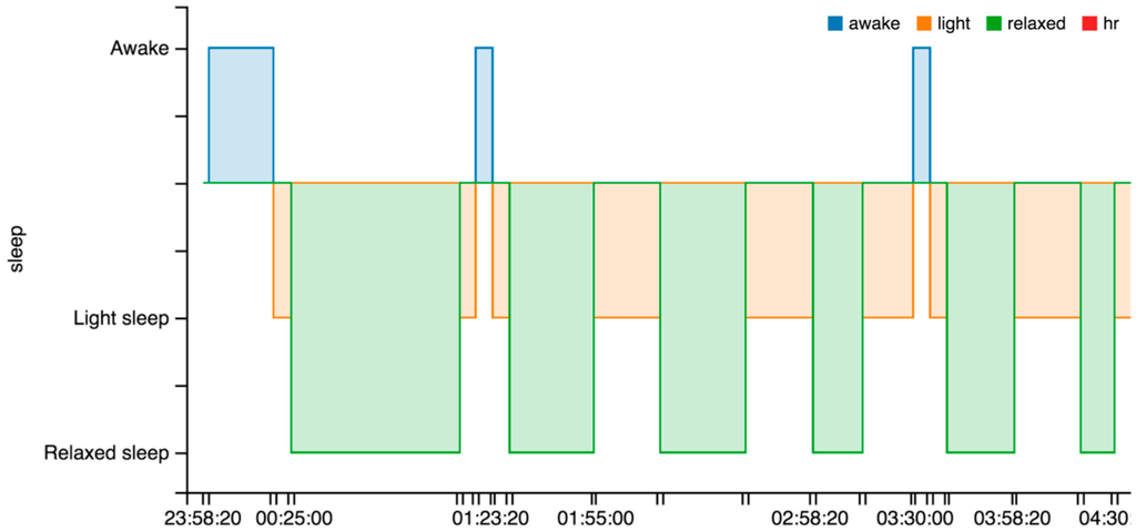 - Apple Health. Its model is also based on segments, but in this case segments can be overlapped [30]. It is possible to find segments in which the user is in bed but not sleeping and other segments in which the user is in bed and sleeping. Situating the segments along a temporal axis, it is possible to know the different sleep states of the user, the total sleeping time, the awake time, etc.