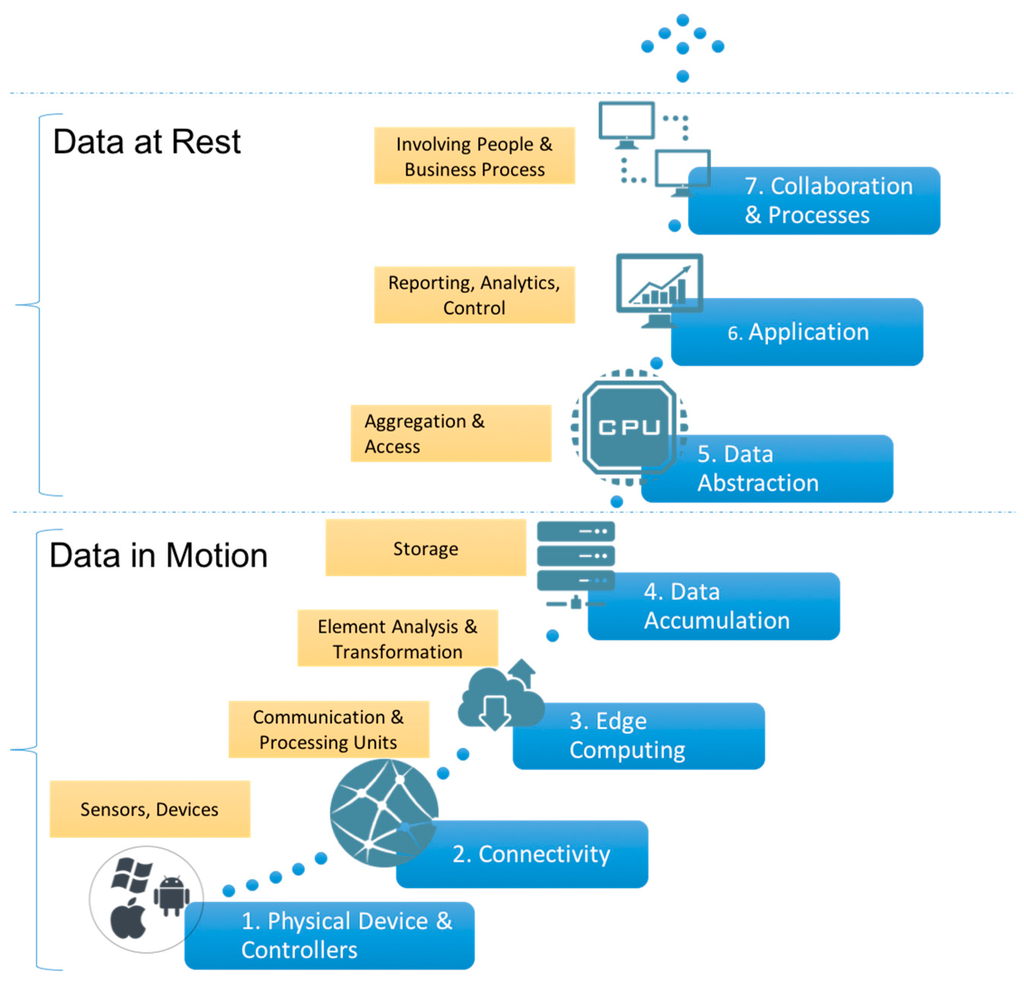 A main interest for the standardization bodies is the development of a framework or reference architecture that arranges the different issues involved. The three aforementioned initiatives are working towards such a result, but currently there is no clear proposal from any of them. Cisco Systems, Inc. has published a white paper with a particular IoT Reference Model that deserves special attention [66]. It is made up of seven layers (cf. Figure 17): (1) Physical Devices & Controllers where sensors and actuators are situated; (2) Connectivity involving reliable and timely data transmission; (3) Edge (Fog) Computing involving initial data element analysis and transformation; (4) Data Accumulation to store data permanently; (5) Data Abstraction, providing services to aggregate and store data; (6) Application, related to the development of reporting, analytics and control; and (7) Collaboration & Processes, involving people and business processes. This model groups layers under two different categories. Layers 1 to 4 are named as “Data in Motion” because data is processed and transformed while it is transferred from lower layers to upper layers. Layers 5 to 7 are named as “Data at Rest” because data is unchanging and stored in memory at each layer. Layer 3 is specifically tagged as “fog computing” because it refers to the idea that information processing can be initiated as early and as close to the edge of the network as possible. In this way the payload of the communications and processing in upper layers is reduced.