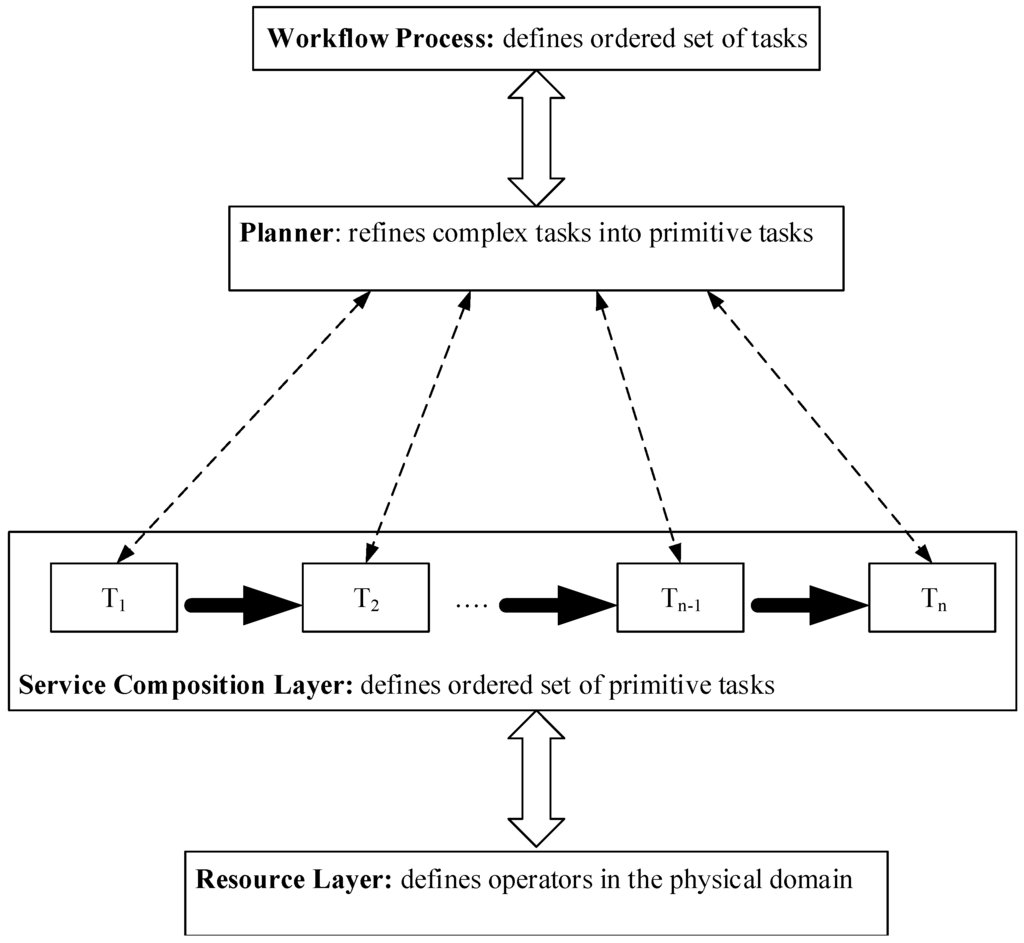 When the workflow is defined as a process, we achieve multi-level collaborative tasks in which each task represents a logical entity contributing to the process. As shown in Figure 1, the workflow process can be simplified by an abstraction to a service composition process of layered roles. This uses a coordinated problem-solving approach to achieve workflow management in which a planner composes primitive tasks from complex tasks in the workflow. In this way, utilities can be initiated to activate operators based on their capabilities for the execution of planned services.