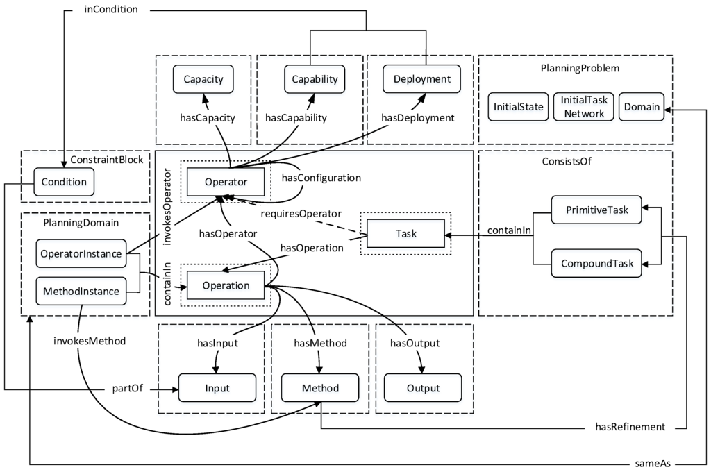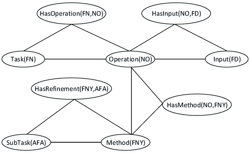 The relation between task and operation, i.e., hasOperation, the relation between operation and operator, i.e., hasOperator, the relation between operation and input, i.e., hasInput, the relation between operation and method, i.e., hasMethod, and the relation between operation and output, i.e., hasOutput, are modeled as object properties. Other object properties, such as hasCapability, which describes the relation between operator and capability, exist at the range of these relations. Data type properties are used to describe relations between address elements and range values, the relation between life cycle and range values and the relation between work cycle and range value.