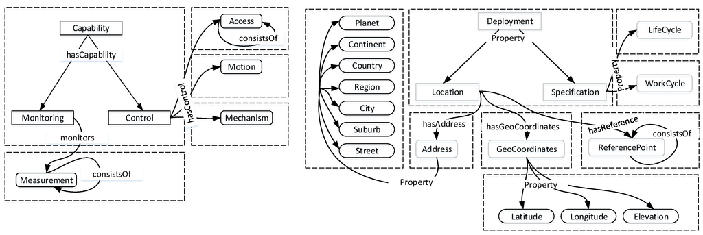 In the HSS ontology, semantic concepts describing task, operation, operator, capability, deployment, input, method and output are of the thing type. The concepts of deployment consist of location and specification. Whilst the concepts of location describe the address, geocoordinates and reference point, the concepts of specification include life cycle and work cycle. The concepts of the address begin at the level of a continent and can be extended to meet domain-specific needs. Furthermore, the capability class describes the concepts of control and monitoring. The concepts of the control class include access, mechanism and motion. The only concept under the monitoring class is measurement.