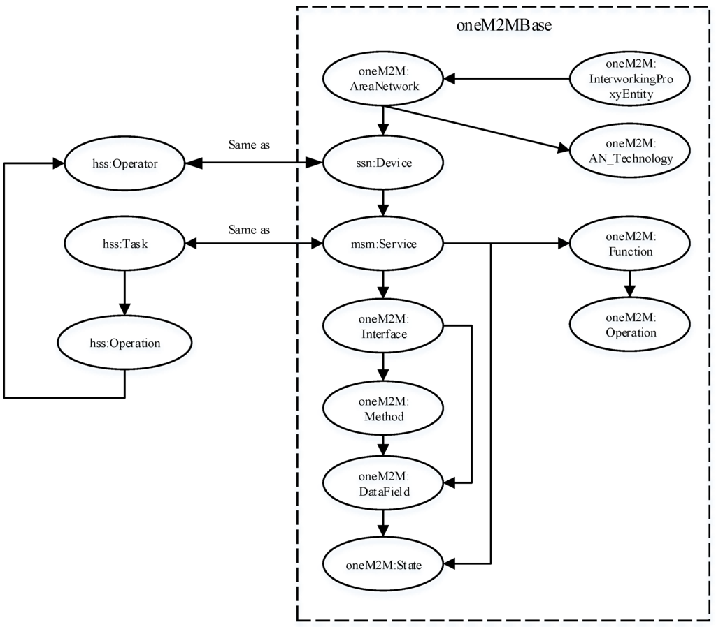 A key advantage with this ontology lies in the flexibility and reusability of concepts with minimum redesign and re-development efforts. As shown in Figure 4, the oneM2M [20] base ontology proposed for generic inter-working with area networks can incorporate task processing by integrating with our HSS ontology.