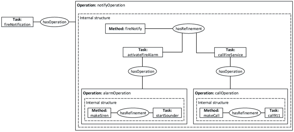 The basic idea serving as a point of departure in MTN on this use case lies in the fact that logic rules for composing MLN can be generated by semantically modeling the use case based on the HSS ontology. Properties and concepts of this ontology provide relations between tasks and their decomposition criteria and define binary MLN predicates, which constitute the task decomposition rules of MTN. Whilst a primitive task represents an operator instance in the HSS ontology, complex tasks can be refined into primitive tasks using these rules. For example, the logic rules for decomposing a high-level task fireNotification into its subtasks are shown below: