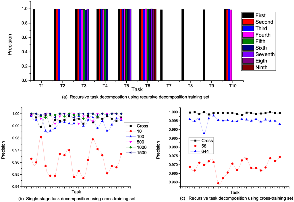 Each nesting of a recursive decomposition represents a single-stage decomposition and provides a single view of multiple task inputs in a recursive decomposition as a unit with an approximately high constant precision value. In this view, the performance of this approach does not depend on the category of training set considered. As we can see in Figure 9b,c, when a recursive decomposition training set is adopted for a single-stage decomposition and vice versa, the performance only depends on the number of ground terms considered. In the cross-training recursive decomposition for instance, the set Cross contained 3000 constants and expectedly outperformed the other sets with a lesser number of constants.