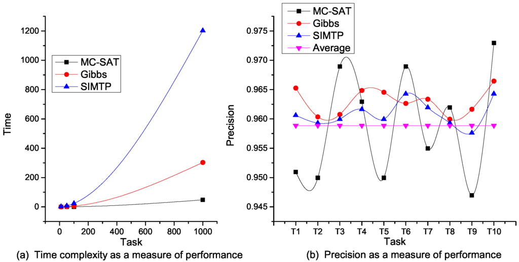 Further, we evaluated the performance of task decomposition on MTN using three MLN propositional and lazy probabilistic inference algorithms [16,24]. As shown in Figure 10, whilst it takes the algorithm which combines Markov chain Monte Carlo and satisfiability (MC-SAT) about 1 s to decompose up to 1000 input tasks, both Gibbs sampling and simulated tempering (SIMTP) require over 5 min to achieve the same results. However, the frequency spectrum of the precision involving Gibbs sampling and SIMTP is smoother than that of MC-SAT. Clearly, these two algorithms represent a good fit for the average precision of MC-SAT, and thus, this statistically makes MC-SAT suitable for CPSs where demand responsiveness is key.