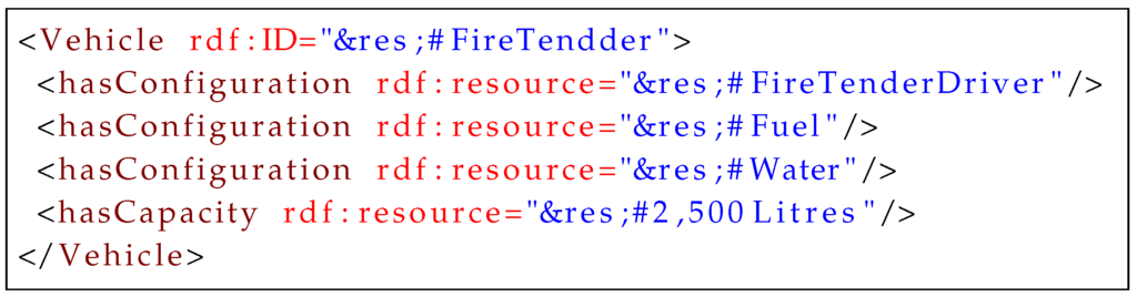 The key property in resource modeling is configuration, which defines all sub-resources of a resource and provides the distinction between simple and complex resources. As shown in Listing 1, the complex resource, fire tender, consists of a fuel tank, which contains fuel as a resource for mobility, and a water tank, which also contains water as a resource for extinguishing the fire. Transporting the water to a fire scene also requires a specialized driver, which is another resource. Because some of these sub-resources can be replenished, a high frequency of replenishing resources can be avoided through capacity modeling. A capacity property defines the capability range of a resource.