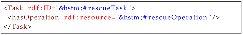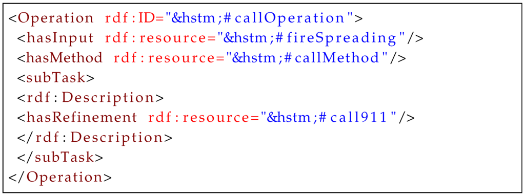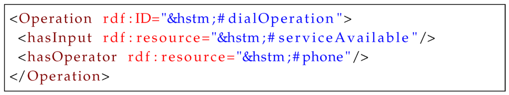 The representations for operator and method instances in operation are used to disambiguate between primitive and complex tasks. To specify operator and method instances, constraints and action effects are modeled as input and output requirements of operations (Listing 3 and Listing 4). Actions of operators leave effects, which can be modeled as the output property of a task operation in CPSs. For each operation, only one method instance is applicable, and the decomposition criteria are specified by a method refinement property.