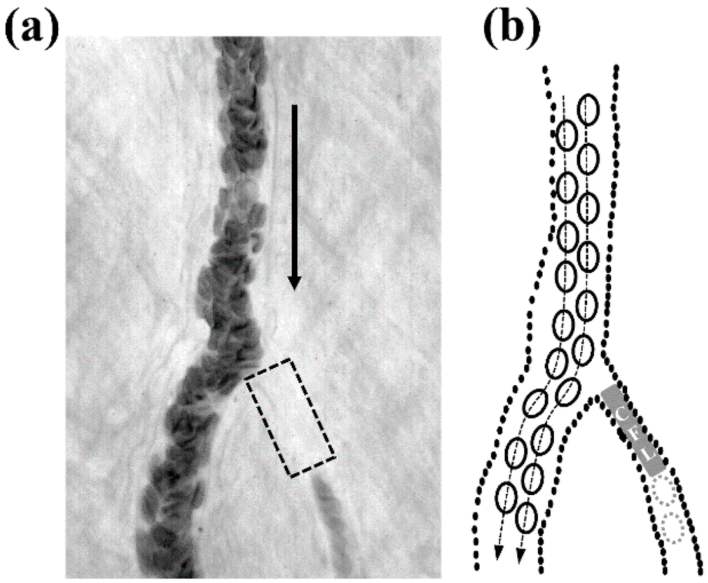In vivo observation of CFL enhancement due to a local hematocrit reduction at an arteriolar bifurcation (a) and its corresponding illustration for RBCs trajectory (b); Dashed and solid arrows indicate the cell trajectory and flow direction, respectively. Bold cells represent RBCs of higher concentration in the main channel while gray cells indicate a lower concentration of RBCs in the daughter vessel.
