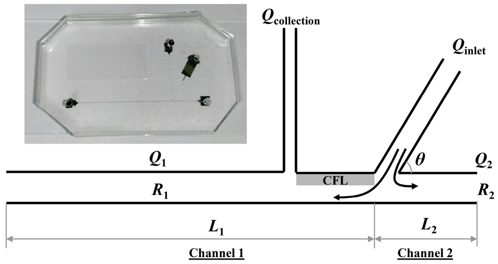 The local hematocrit reduction for enhancement of the CFL width near the plasma collection channel (Qcollection) was achieved by varying the flow rate ratio between the two downstream branches (Q1:Q2 = 1:4). The flow rate ratio was determined by resistance difference (R1:R2 = 4:1) resulting from the channel length ratio between the two outlet branches (L1:L2 = 4:1). The lengths of channel 1, channel 2, the collection channel, as well as the distance between the inlet and collection channel were 2 cm, 0.5 cm, 0.5 cm and 60 µm, respectively. Various ranges of inlet flow rates (Qinlet: 20, 40, 80 µL/min) and angles (θ = 30°, 45°, 60°) were examined for maximizing the plasma separation. The channel widths of the inlet, outlet and collection channels were 15, 30, 5 µm respectively. The depth of the channels was 30 μm.