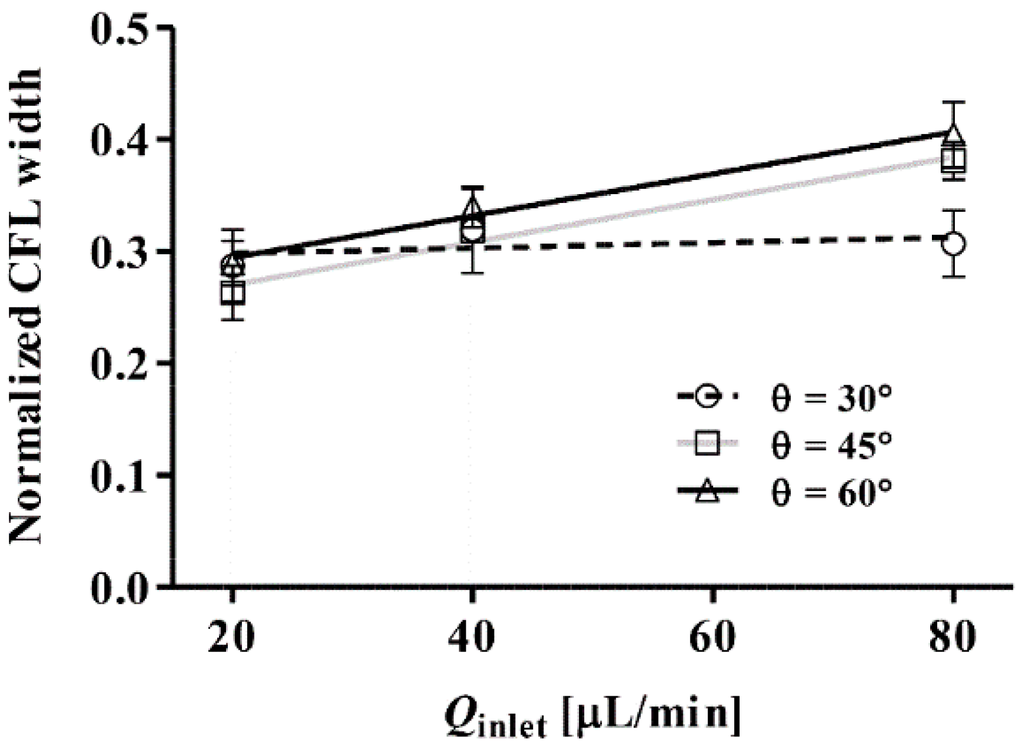Figure 4 shows the effect of inlet flow rate (Qinlet) on the normalized CFL width for different inlet angles (θ). The CFL width was measured near the collection channel, and it was normalized by the downstream channel width (30 μm). A significant linear relation between the CFL width and Qinlet was found for θ = 45° and 60° (P < 0.01). The CFL width exhibited an apparent independence from Qinlet when θ = 30°. This may be attributed to the dominance of the horizontal component of the RBC momentum over the vertical component at such an acute angle. As θ increased to 45° and 60°, RBCs entering from the inlet channel were pushed closer to the bottom wall of the collection channel. It is of note that we did not perform experiments for θ = 90° since it was thought that the CFL width, and hence the plasma yield and purity, would be reduced as the bifurcation angle increases to 90°. This may be understood by considering the effect of the bifurcation angle on the pressure loss at the bifurcation point. At the bifurcation angle increases, the pressure loss due to viscous losses (as the flow changes direction) reduces the flow velocity in the daughter channel 1. As such, the pressure driving the flow in channel 1 is reduced. Hence, in accordance with the Zweifach-Fung Bifurcation Law, the difference in pressure between channel 1 and the collection channel is reduced, hence reducing the thickness of the CFL.