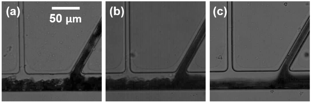 Typical examples for plasma separation from 40% hematocrit blood samples with the bifurcation angle of θ = 60° at 20 µL/min (a); 40 µL/min (b) and 80 µL/min (c) of flow rate (Qinlet).