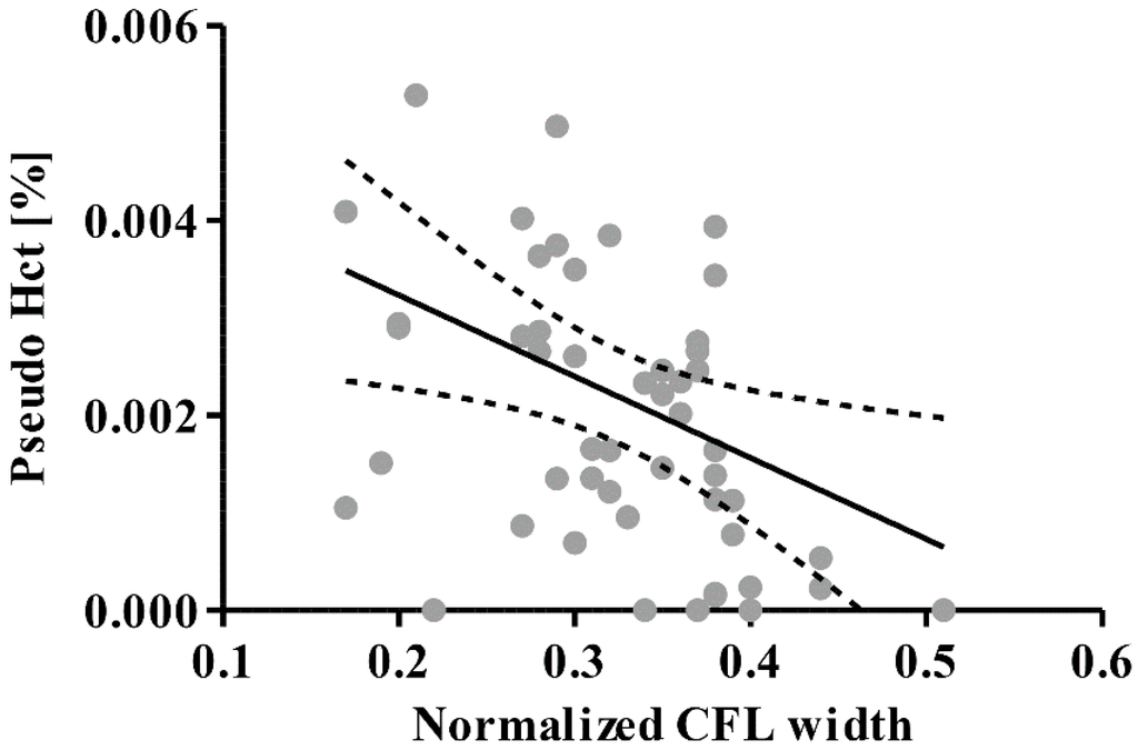 Pseudo hematocrit (Hct) of separated plasma as a function of CFL width. Solid and dashed lines represent a regression fit and 95% confidence band, respectively.