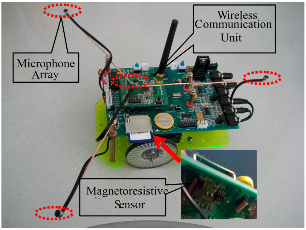 Some research studies which center on visual human machine interaction have been performed [1,2,3,4]. However, the robotic audition system that integrates the multifunctional task of recognizing, localizing and searching sound targets plays much a more important role in darkness or shaded areas and all-direction detection conditions [5,6]. It is said that such robots in real environments have not been commonly developed although cooperative multi-robot systems through wireless sensor networks (WSNs), using the robot’s audition capabilities have been studied by various research laboratories [7].
