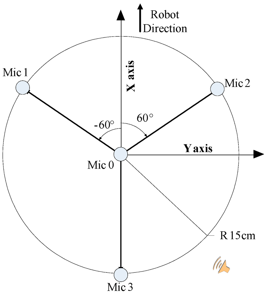 In this paper, the arrangement of the 4-channel microphone array is as shown in Figure 3. It centers on the microphone 0 and its radius is 15 cm, presenting 120° round-shaped placement. Designing such a shape assists the rough estimation of sound source location by making use of three arbitrary microphones, and the system has the ability to make a pre-judgment of sound location by the calculation of TDOA. We illustrate this situation when the sound source is in the position in Figure 3. It is not difficult for us to find out the sound direction according to the difference of time delay between microphone 2 to microphone 0 and microphone 3 to microphone 0.