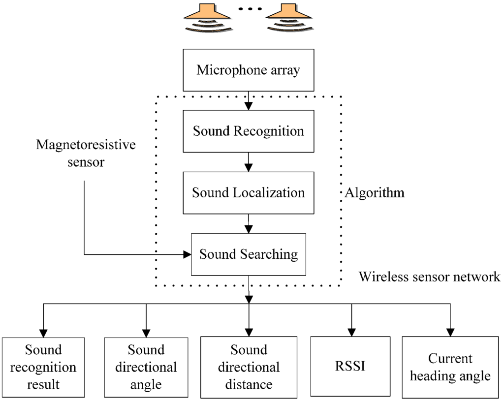 Animals have evolved more sophisticated strategies to address the difficulty of searching for sound sources, and the most significant feature lies in the complex structure of the ear’s audio system. How to simplify its construction is also studied by various research laboratories, but few achievements have been made because the animal’s ear audio system itself is rather complex. Therefore, the microphone array structures used in research are generally huge, for example, a 128-channel huge microphone array was used for sound source localization in [7]. It is unrealistic that such structure be applied to a robot in a WSN. Furthermore, searching for a sound target is not a straightforward task for a robotic agent, and it also involves sound identification, localization and motor driving. Therefore, we aim to implement such a robot system in task-oriented collaboration (TOC) using wireless senor networks for searching sound target, which also can simplify its structure and improve the accuracy.