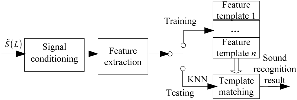 Figure 6 shows the architecture of template matching. In our experiments, we have utilized different sound signal features for training and testing sets. At the training stage, we extract the MFCCs of three pure signals and then they are stored into a template database denoted template A, B, C, while at testing stage, we collect MFCCs of three noisy signals and then compare them with template database based on the KNN classification algorithm.