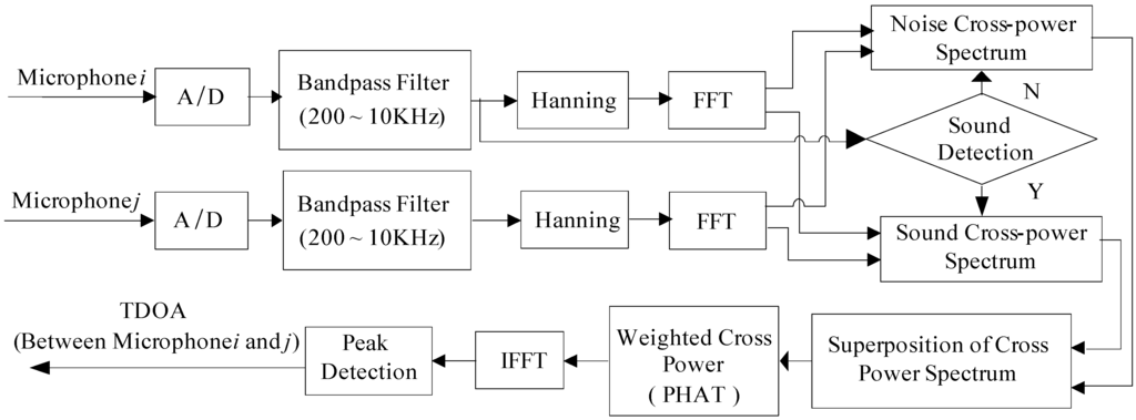 The research uses a 4-channel microphone array, and this paper needs groups TDOA between two arbitrary microphones. Figure 7 shows the architecture of estimating the time delay by the IGCC method and it is illustrated for microphone i and microphone j. Microphone i is used to detect whether the collected signal is a sound signal based on short time average zero-passed rate, which can remove the passive effect of ambient noise. If the current audio signal frame is noise caused by the digital circuits or environmental noise, its power spectra is denoted as Noise Spectra. Afterward, if the following frame is a noisy audio signal, its power spectra is denoted as Noisy Audio Signal Spectra. Therefore, the applicable power spectral computing TDOA is their difference between noisy audio signal spectral and noise spectra.