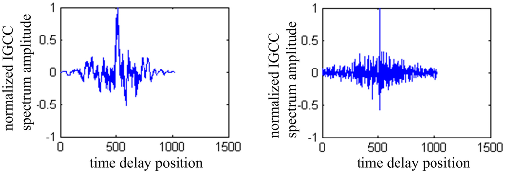 Figure 8 shows the TDOA result of traditional GCC and IGCC. In the left figure, the moment of the peak is not sharp when using GCC, whereas the IGCC has a sharper peak shown in the right one.