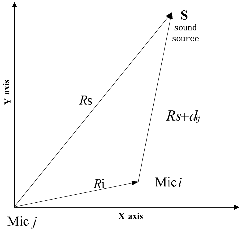 We first map the spatial origin into two arbitrary microphone sensors, say the ith and jth as shown in Figure 9. The distance from the jth microphone to the ith microphone is denoted Ri = |ri|. The distance between the sound source and jth microphone is denoted Rs = |rs|, and the distance between the source and ith microphone is denoted Rs + dij, where ri and rs are the corresponding vectord, and dij is distance that is calculated based on TDOA between ith and jth microphone. These quantities appear in Figure 9.