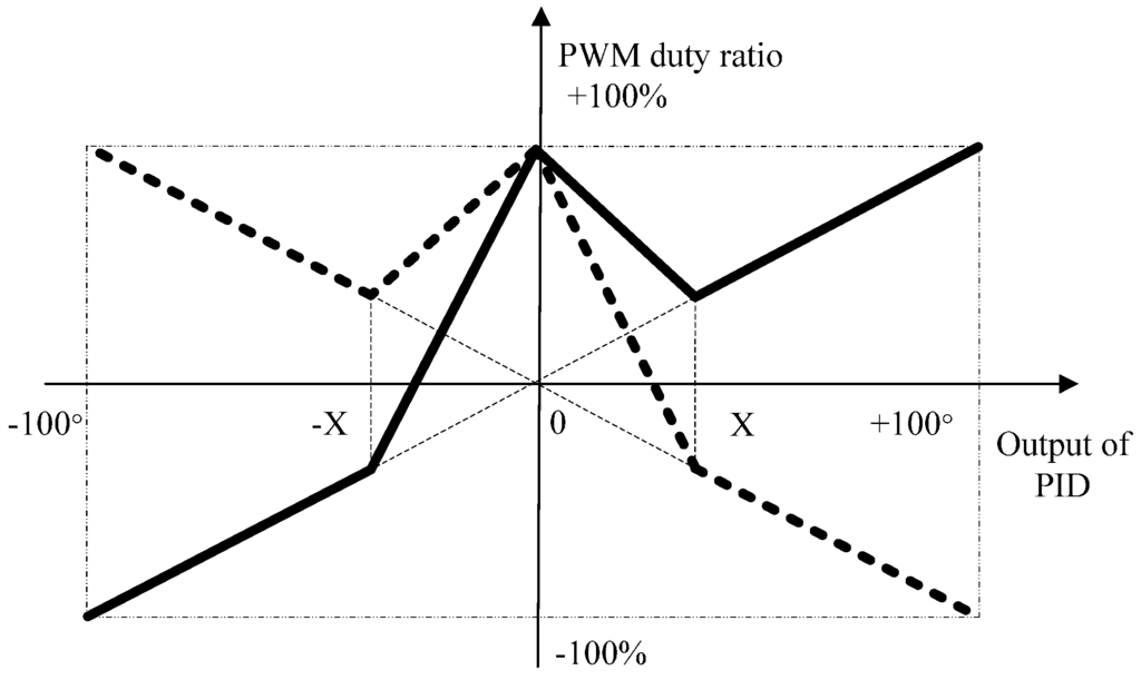 Figure 10 shows the mapping relation between them. The solid line represents the PWM duty ratio of one motor, while the dashed line represents the other. The threshold value X is selected in the experiment, and heading angle deviation is limited to ±100°.