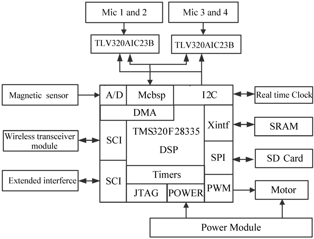 In order to verify the above algorithms, a real-time sound target-searching three-robot platform in a WSN is implemented using the high-performance, floating point DSP TMS320F28335 of Texas Instruments (TI, Dallas, TX, USA), which combines the advantages of providing rich controlling functions with the capacity of implementing complex algorithms. It acquires the output signal of the 4-channel microphone array and magneto-resistive sensor synchronously by the direct memory access (DMA) transfer technology, which achieves the data transfers efficiently, especially for the massive audio data collection. After signal conditioning, the DSP processor completes the sound recognition and localization, and sound searching algorithm. Then their processed results are output to the PC through the WSN. The result information mostly includes the sound identification result, sound source direction angle and current heading angle of the robot , and the RSSI between robots. Finally, the PC makes a judgment and returns the decision result to the right robot, in addition, the right robot starts to move in the right direction while the other robots keep still. Figure 11 shows the schematic architecture of the DSP system.