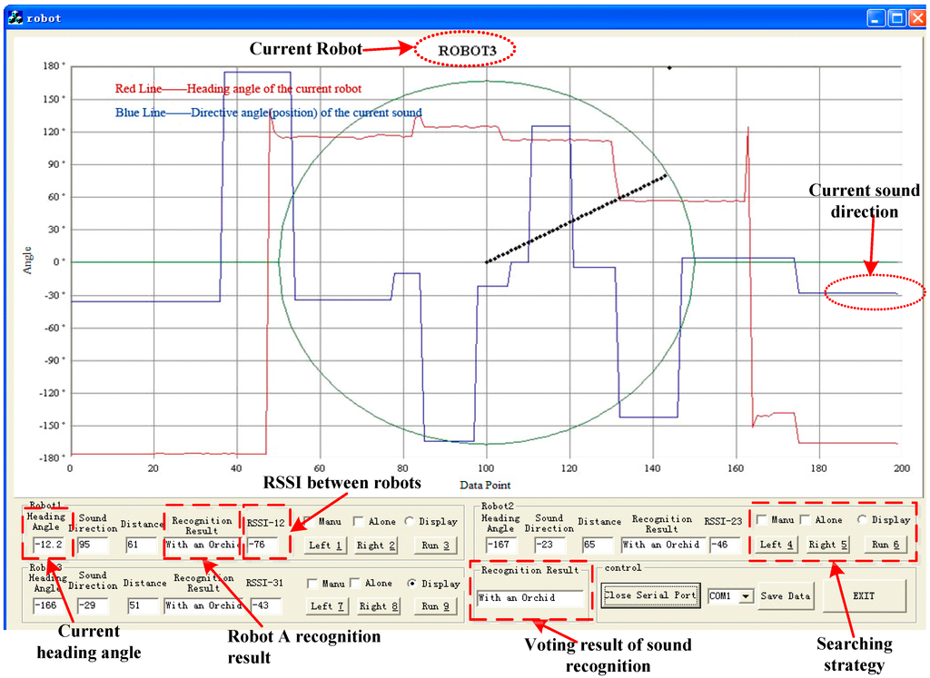 Thirdly, the PC displays the above information from each robot shown in Figure 13; meanwhile it has the ultimate power to make a comprehensive judgment and then return the decision result to the right robot by using the WSN. For example, when the received sound recognition result sent by the three robots is type A, A and B or type A, A, and C, the PC may consider it as type A.